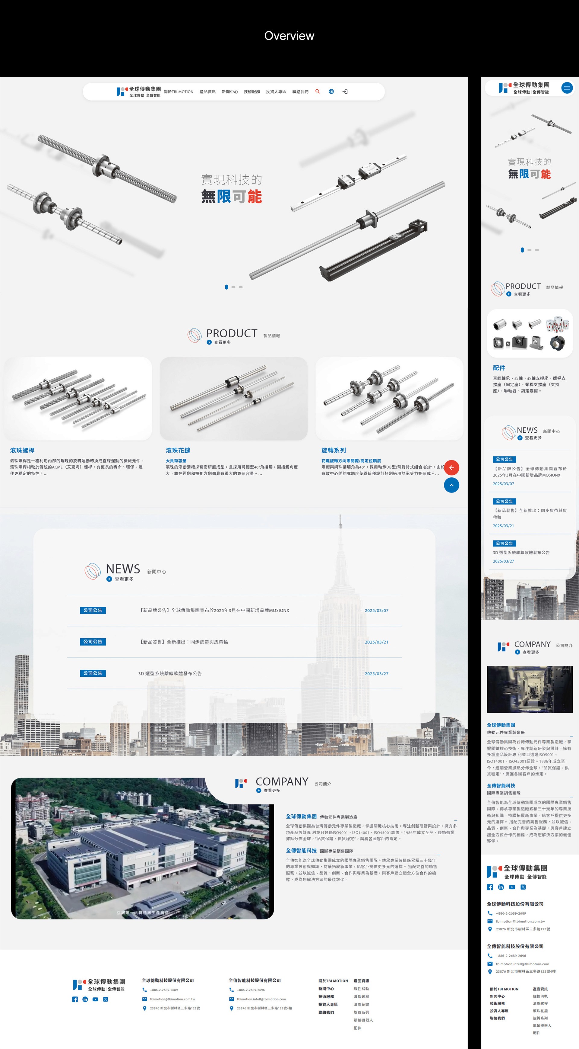 以科技創新與精密傳動為核心,打造一個直觀且互動性強的數位平台。主視覺採用破題式呈現,聚焦客戶主要銷售的五大產品類別:滾珠螺桿、線性滑軌、滾珠花鍵、單軸機器人與旋轉系列。這些元素以浮動式圖像散佈於首頁,象徵無限延伸的機械動能,讓使用者一目了然地感受到企業的專業調性——深度、精準與前瞻性。為提升互動體驗,我們融入滑鼠視差效果,讓產品圖像隨游標移動產生輕微位移,營造立體深度感,彷彿使用者親手觸碰傳動組件。